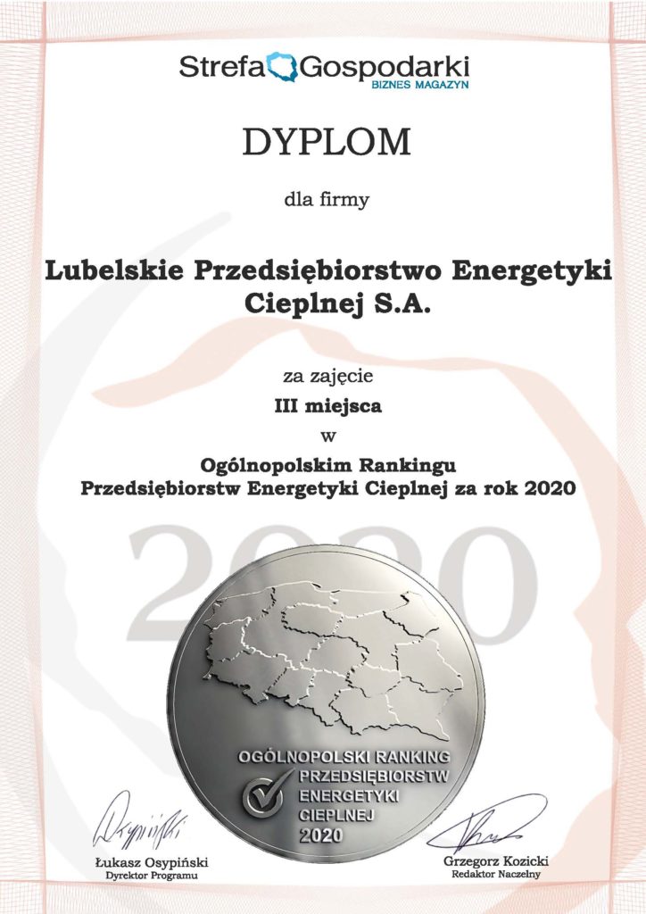 Z dumą i satysfakcją informujemy, że kolejny rok z rzędu LPEC S.A. znalazł się w czołówce Ogólnopolskiego Rankingu Przedsiębiorstw Energetyki Cieplnej. W plebiscycie, który przygotowuje magazyn „Strefa Gospodarki”, lubelska spółka zajęła trzecie miejsce.